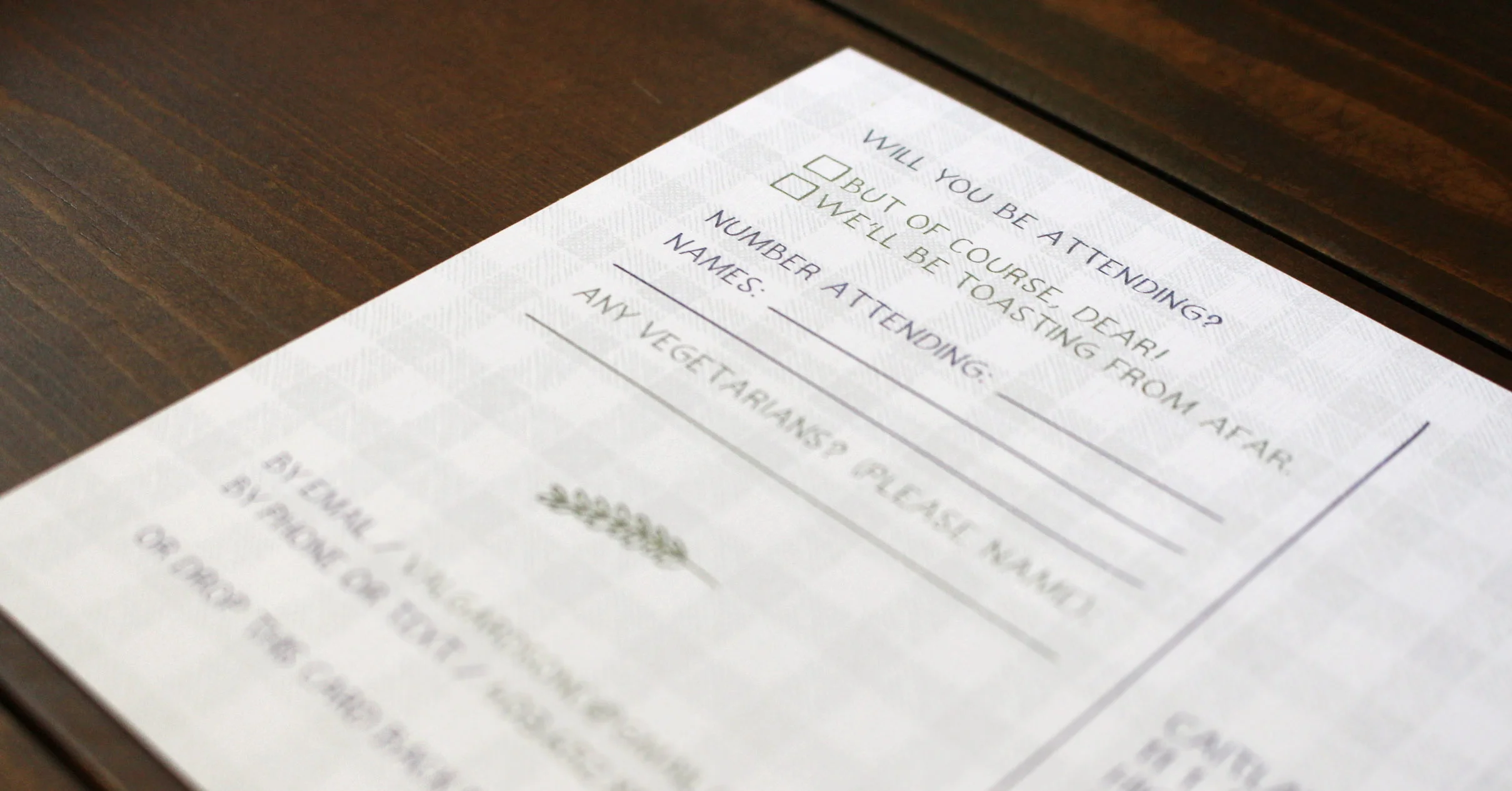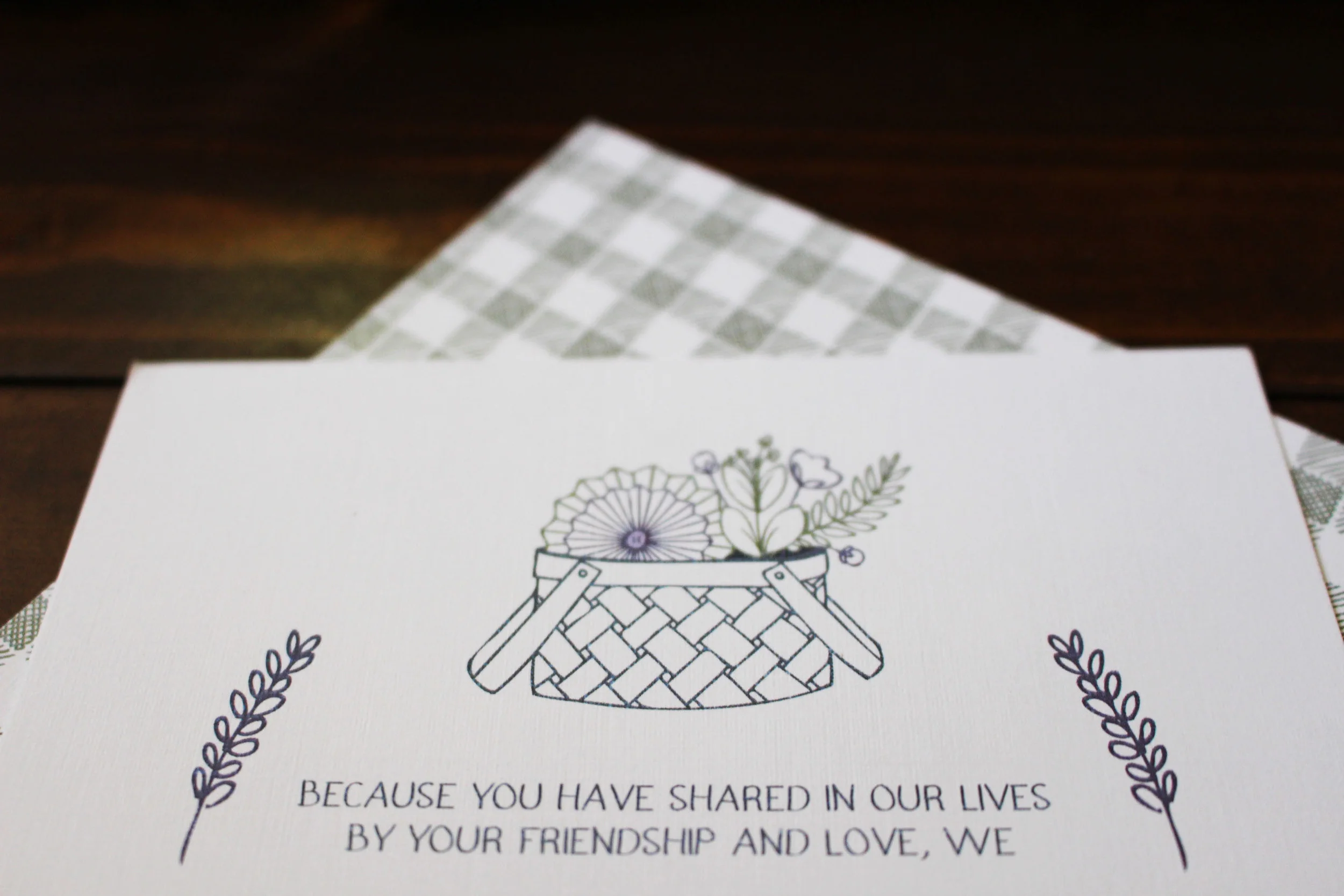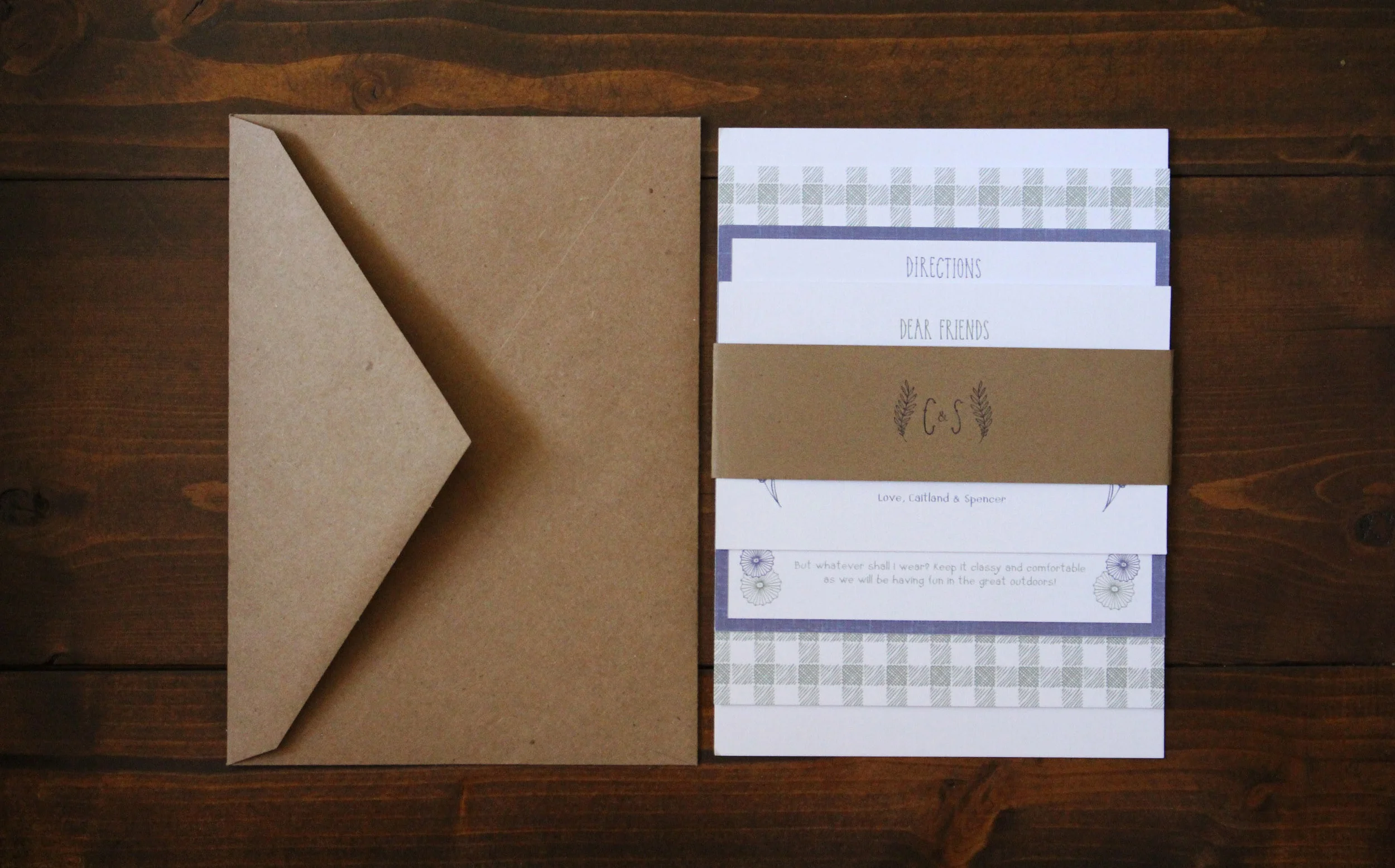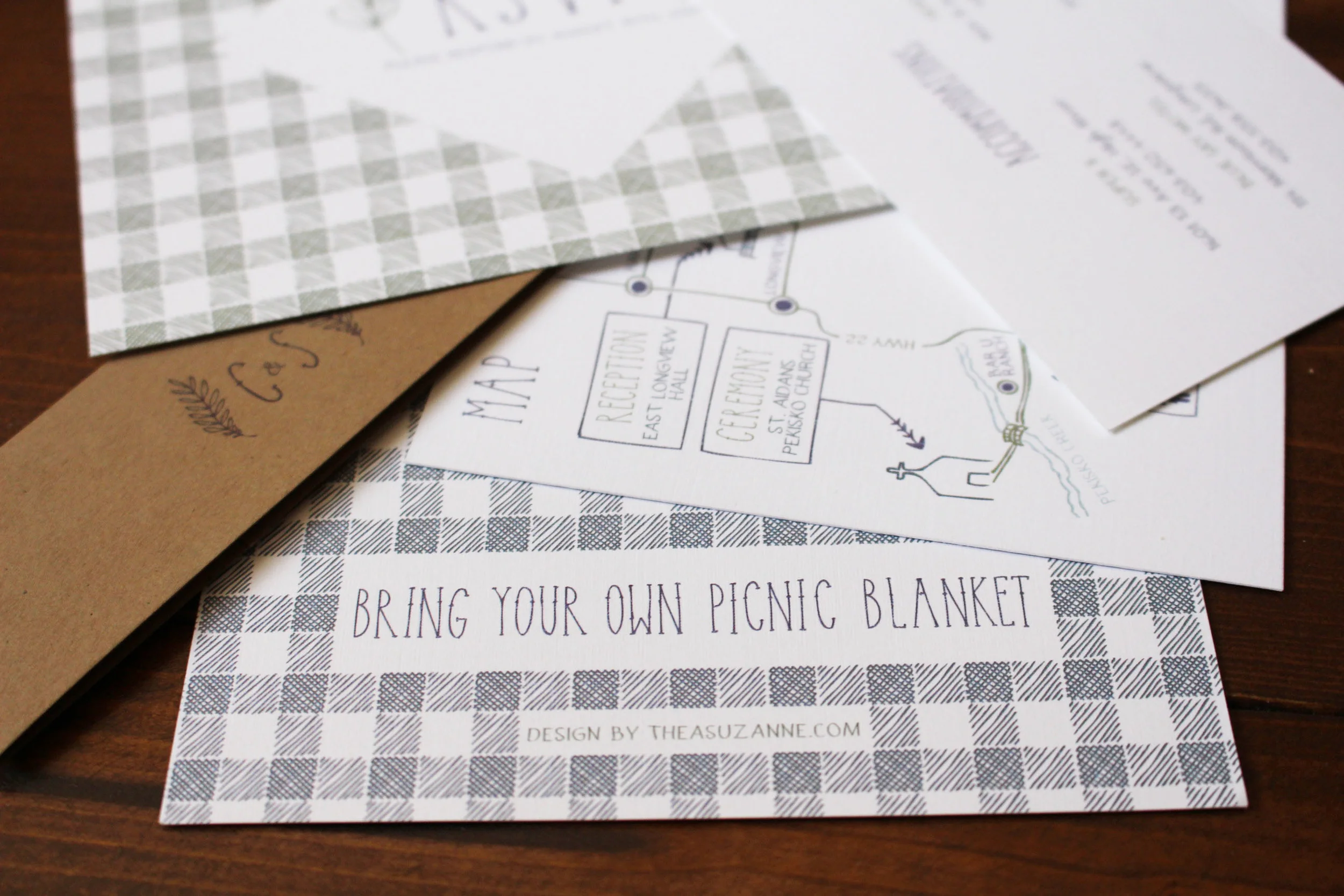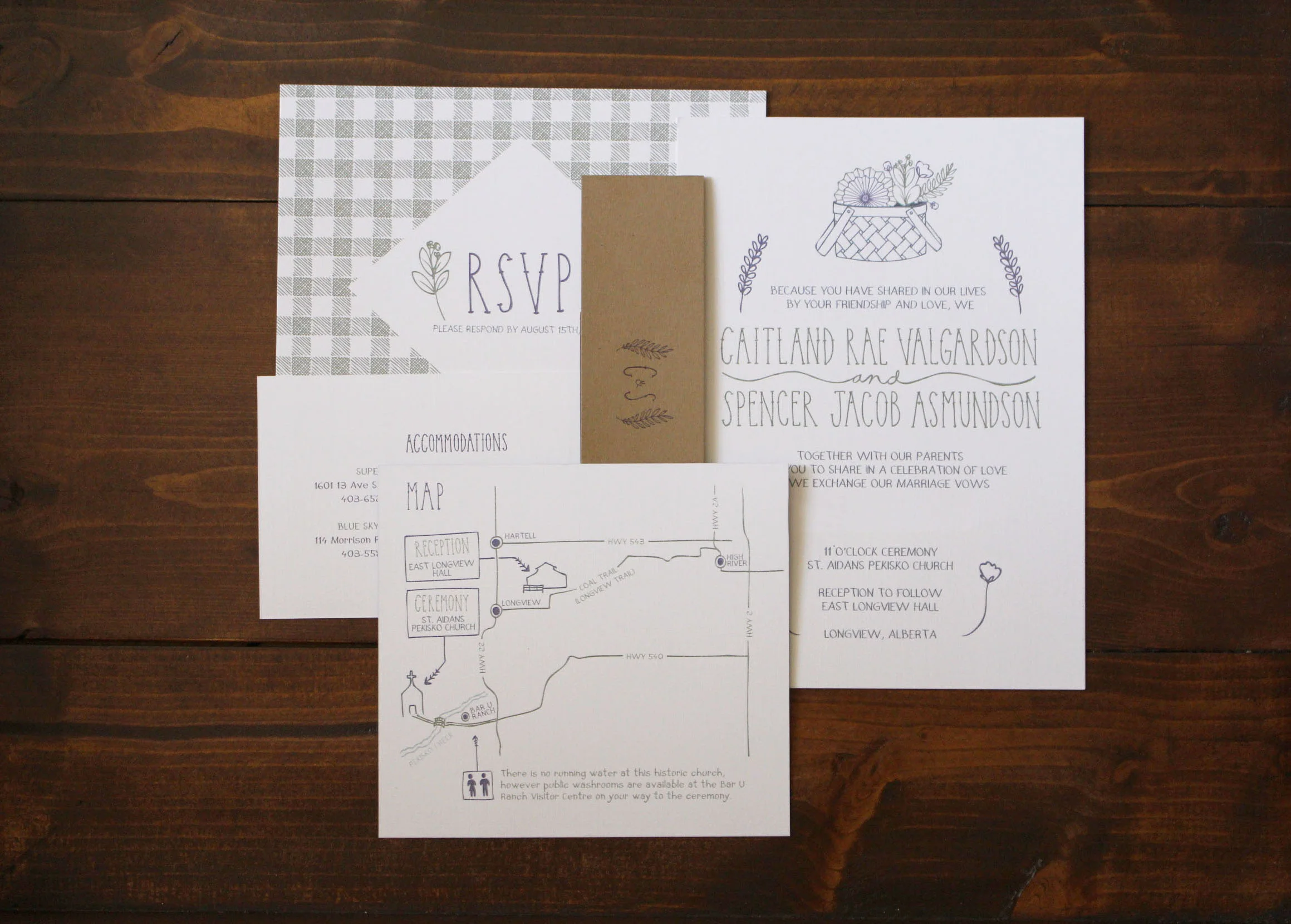 This couple got hitched in a small church out in the Albertan countryside with a reception to follow nearby. Their wedding had a very easy-going country picnic feel to it, and I wanted to reflect that in their invitations. All the images and the country-style font were hand-drawn. BYOPB (Bring Your Own Picnic Blanket)!