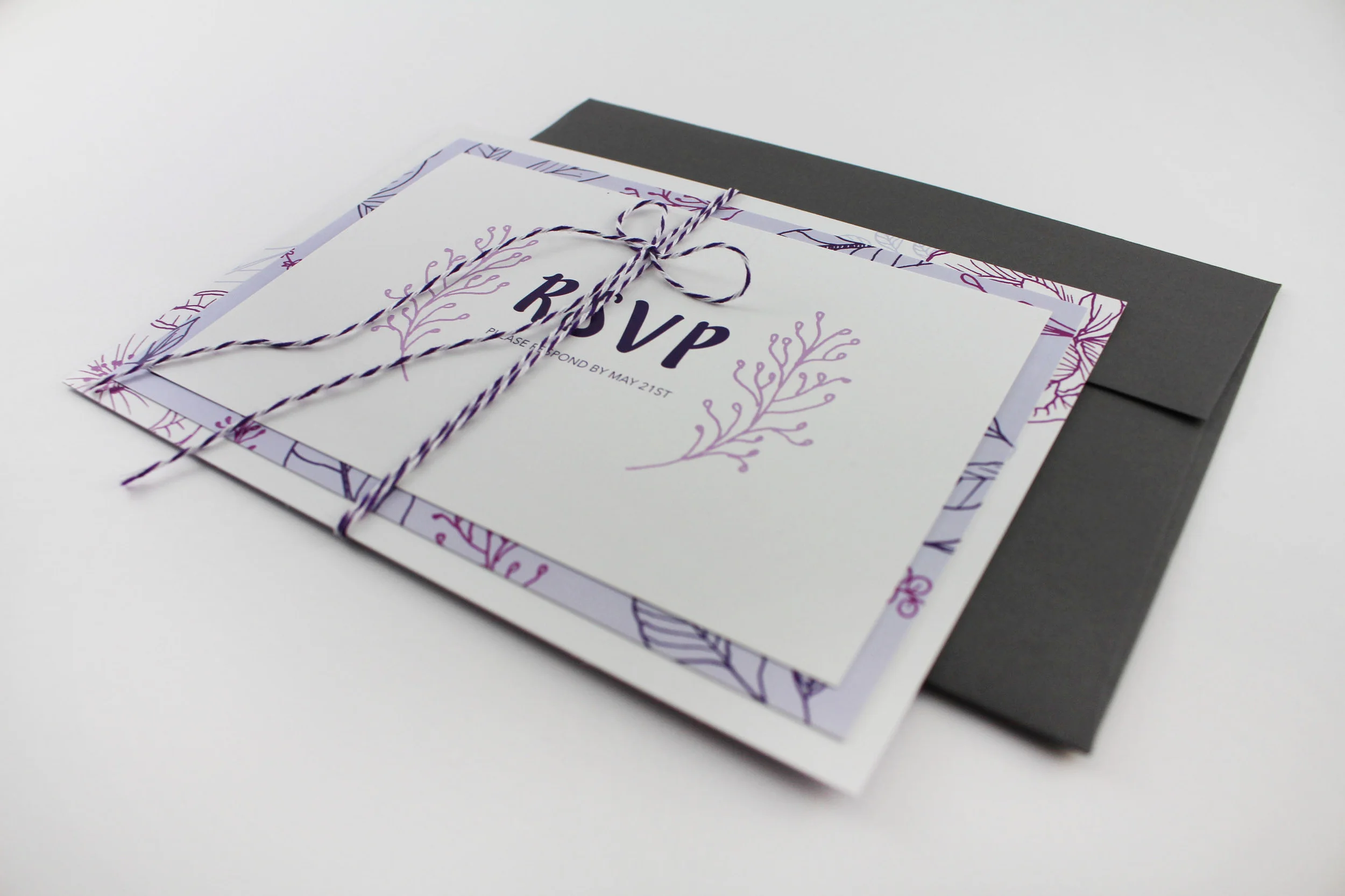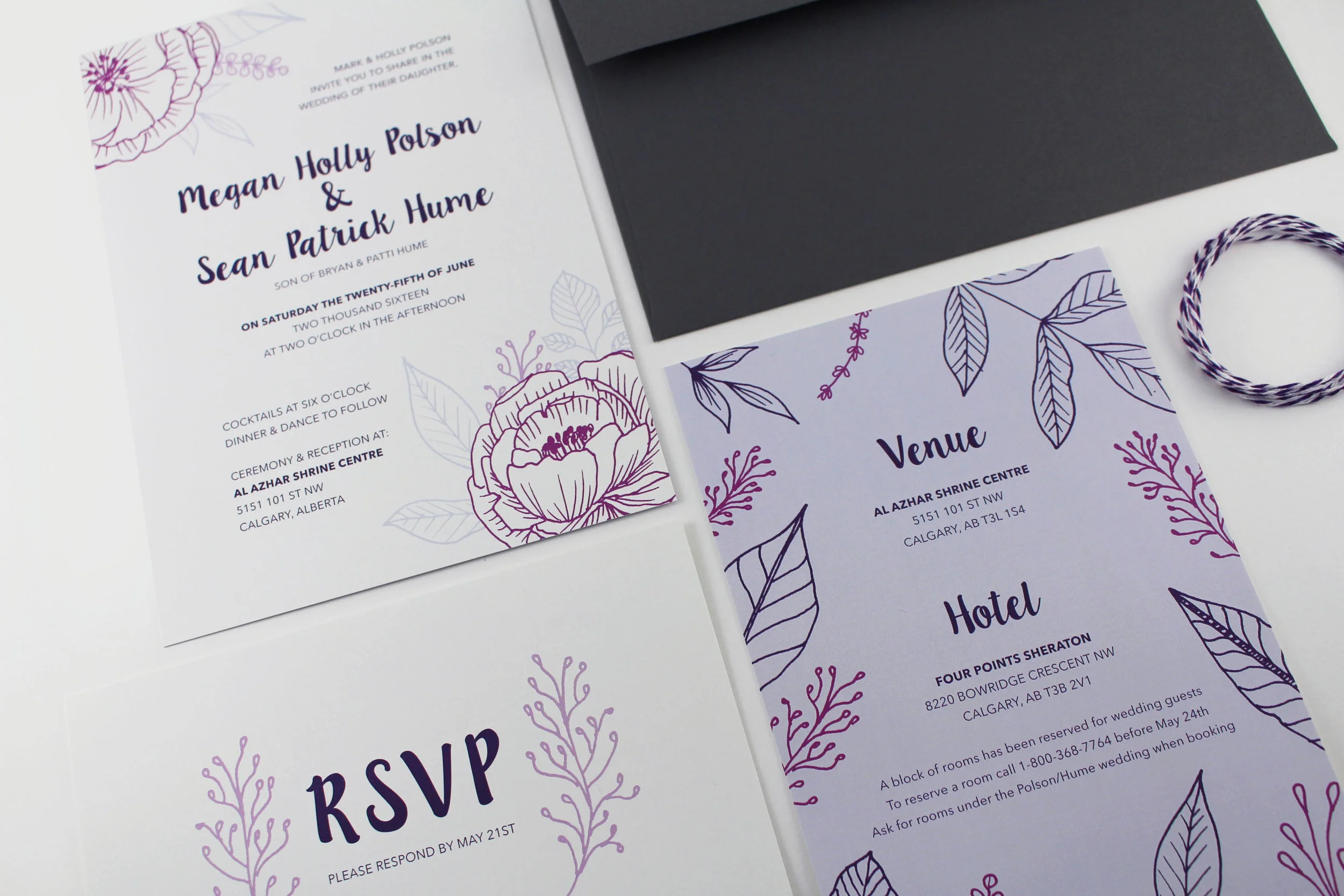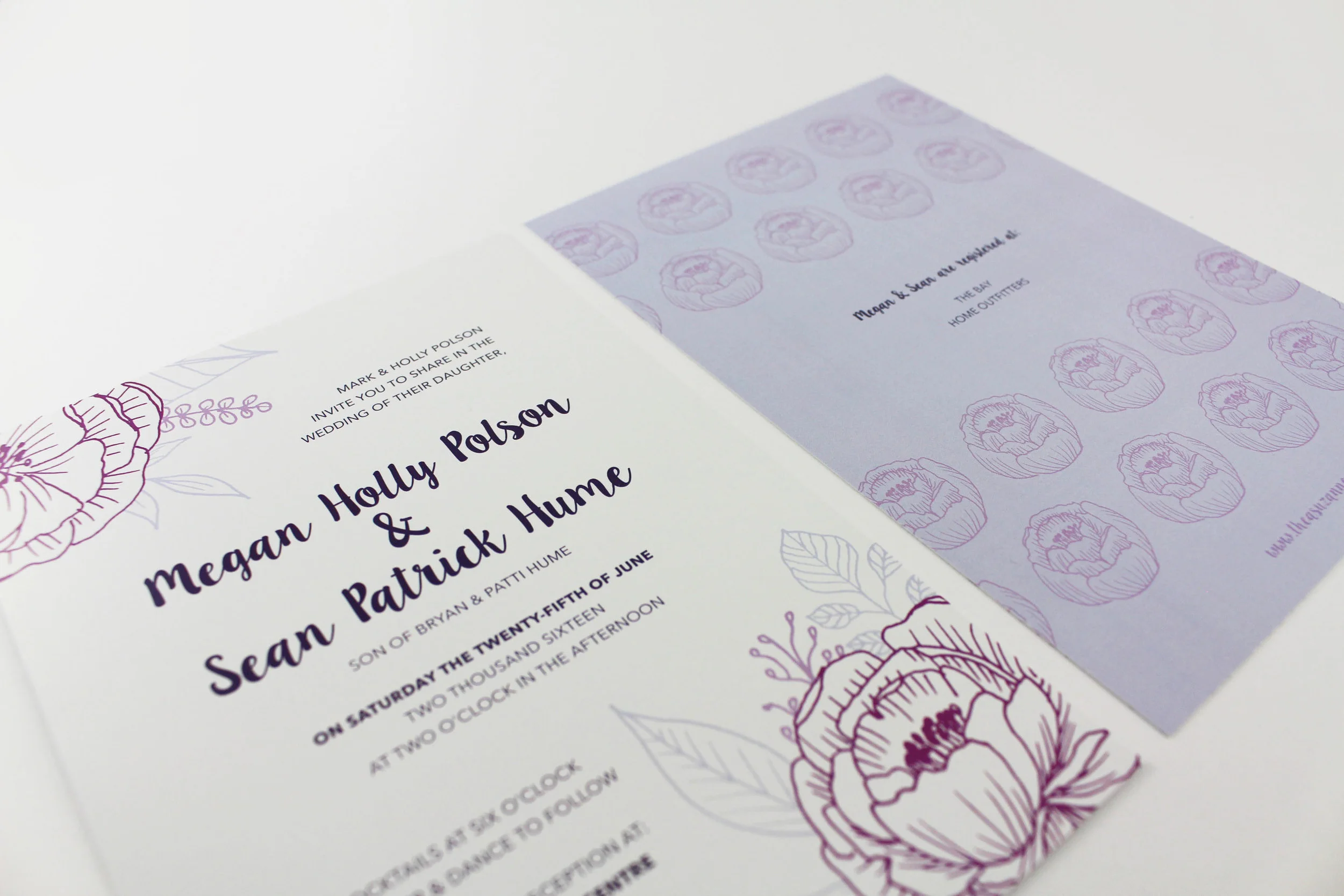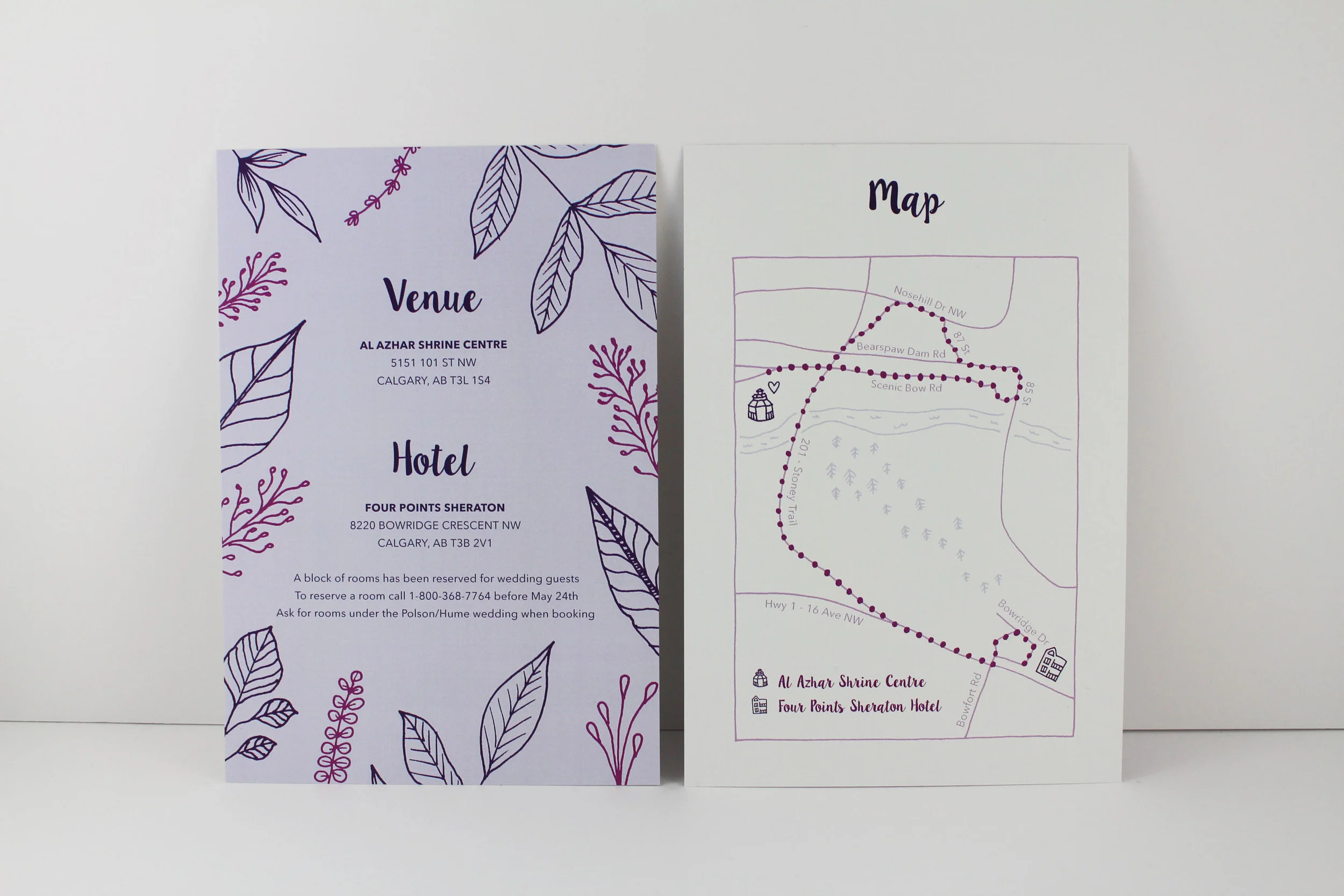 A wedding invitation designed to match the florals and colours of the couples big day. Its always a fun addition to include a hand drawn map to direct guests to the various destinations. All tied together with some coloured string to create a beautiful and cohesive wedding suite.