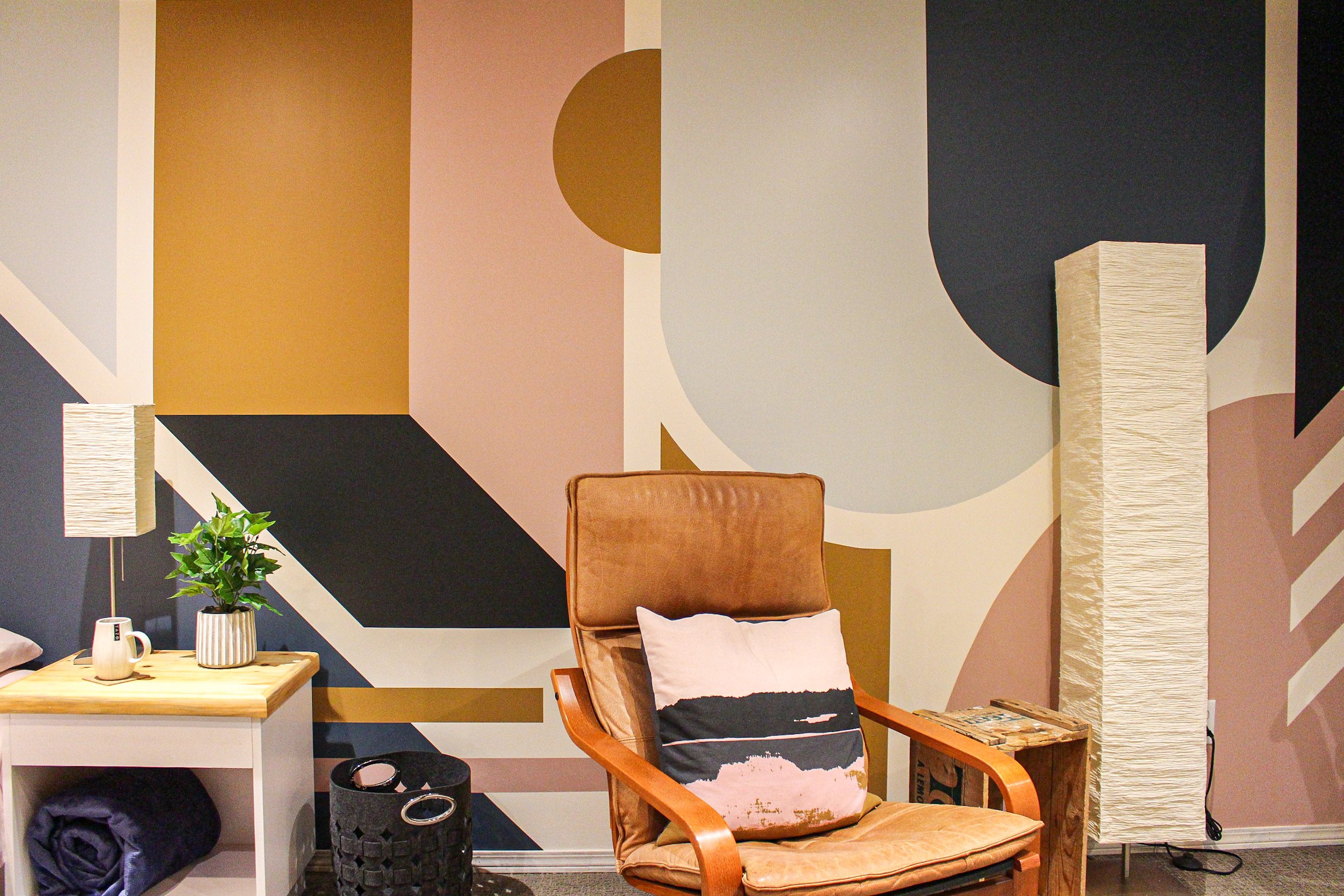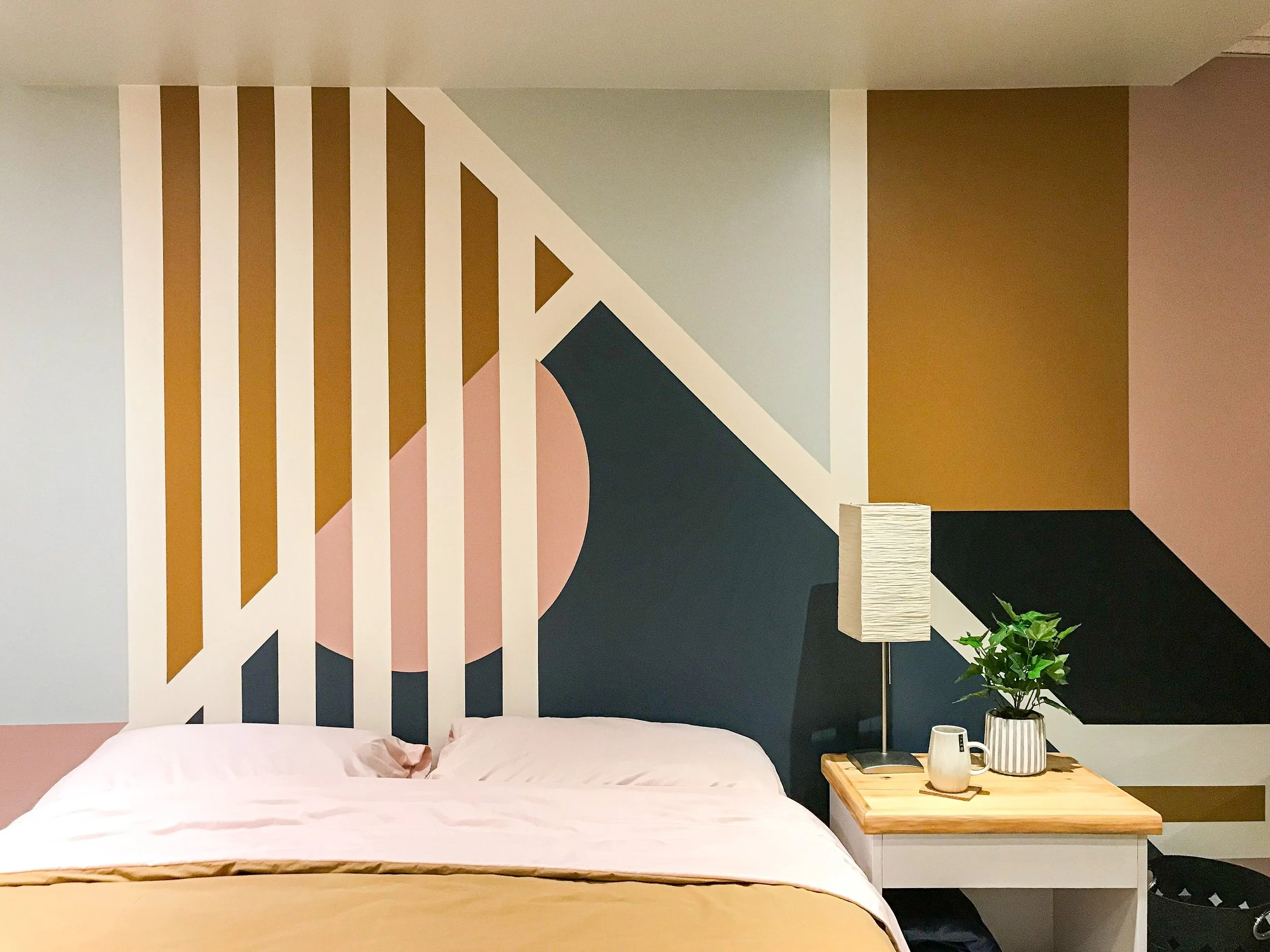 The mural in this space transforms the atmosphere into that of a boutique hotel. Stylish, fun, and welcoming for every guest.
